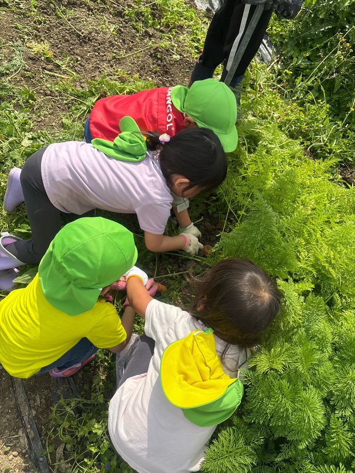 いざ収穫!!0歳児の時は、土に触れない子も数名いましたが、今では子ども達自ら土に触れ、先生のお手本を見ながら、楽しく収穫体験が出来ました★